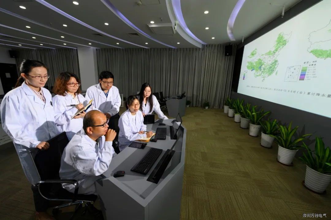 中国电科院数值天气预报团队在实验室研讨电力气象预报结果