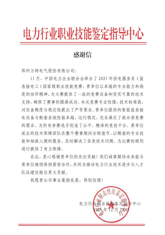 信中,电力行业职业技能鉴定指导中心对万特电气“卓越的专业能力和高度的协作精神”表示高度肯定。