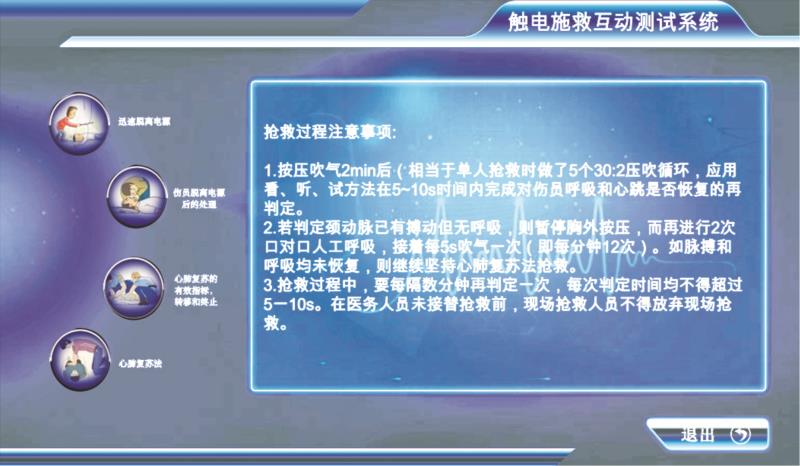 以情景再现方式模拟虚拟 场景下触电事故现场,让 学员选择不同的物品进行 施救,掌握发生触电事故时使用正确的物品进行施 救,掌握怎样使伤者正确 脱离电源的步骤。掌握现 场心肺复苏正确方法,系 统记录学员施救过程并给 以评判结果。